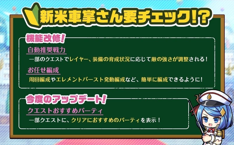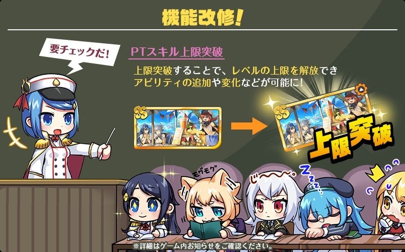 自動推奨戦力やお任せ編成機能の改善、PTスキルの上限突破など、プレイヤーのプレイ体験を向上させる改良が施されました。
