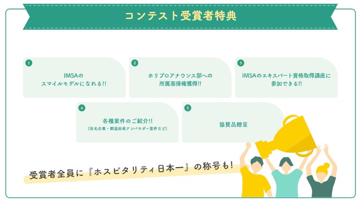 - 特典として、IMSAのスマイルモデルになる機会やホリプロアナウンス部への所属面接権、エキスパート資格取得講座への参加などがある