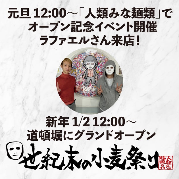 大阪の人気ラーメン店「人類みな麺類」が、YouTuber「ラファエル」とコラボした新ブランド「世紀末の小麦祭り」のオープン記念イベントを開催します。