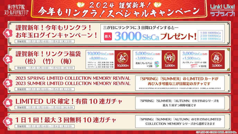 - お年玉ログインキャンペーン、福袋販売、復刻ガチャ、UR確定有償10連ガチャ、無料10連ガチャ