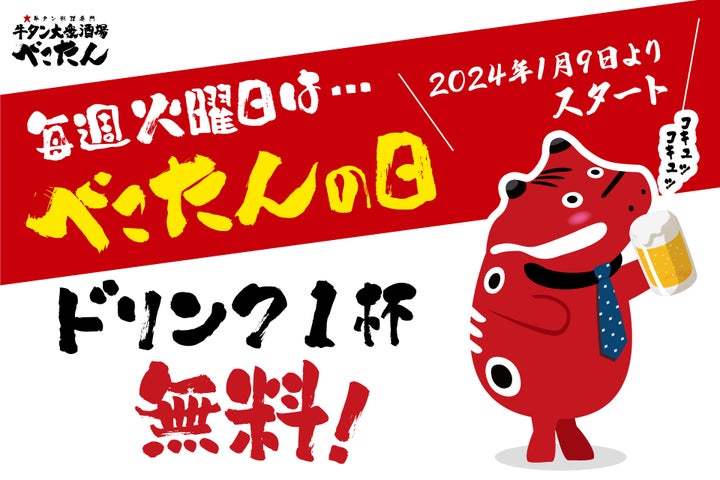 株式会社subLimeは、牛タン大衆酒場「べこたん」にて、毎週火曜日を「べこたんの日」として定めました。