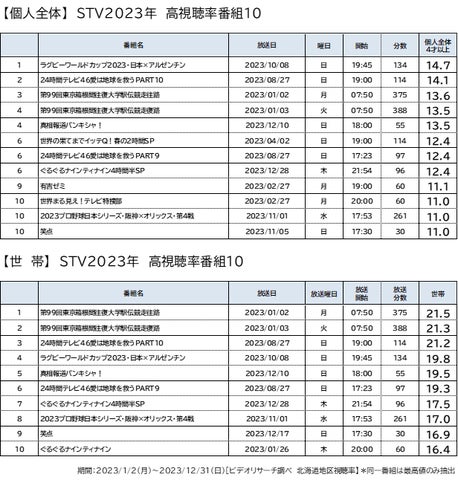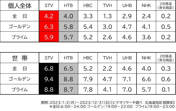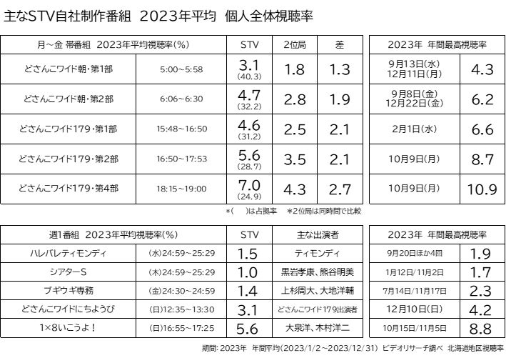 - 札幌テレビ放送(STV)は2023年に個人視聴率と世帯視聴率の両方で3冠を達成