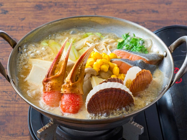 - 北海鍋は蟹や秋鮭、帆立を贅沢に盛り込んだ甘味と旨み