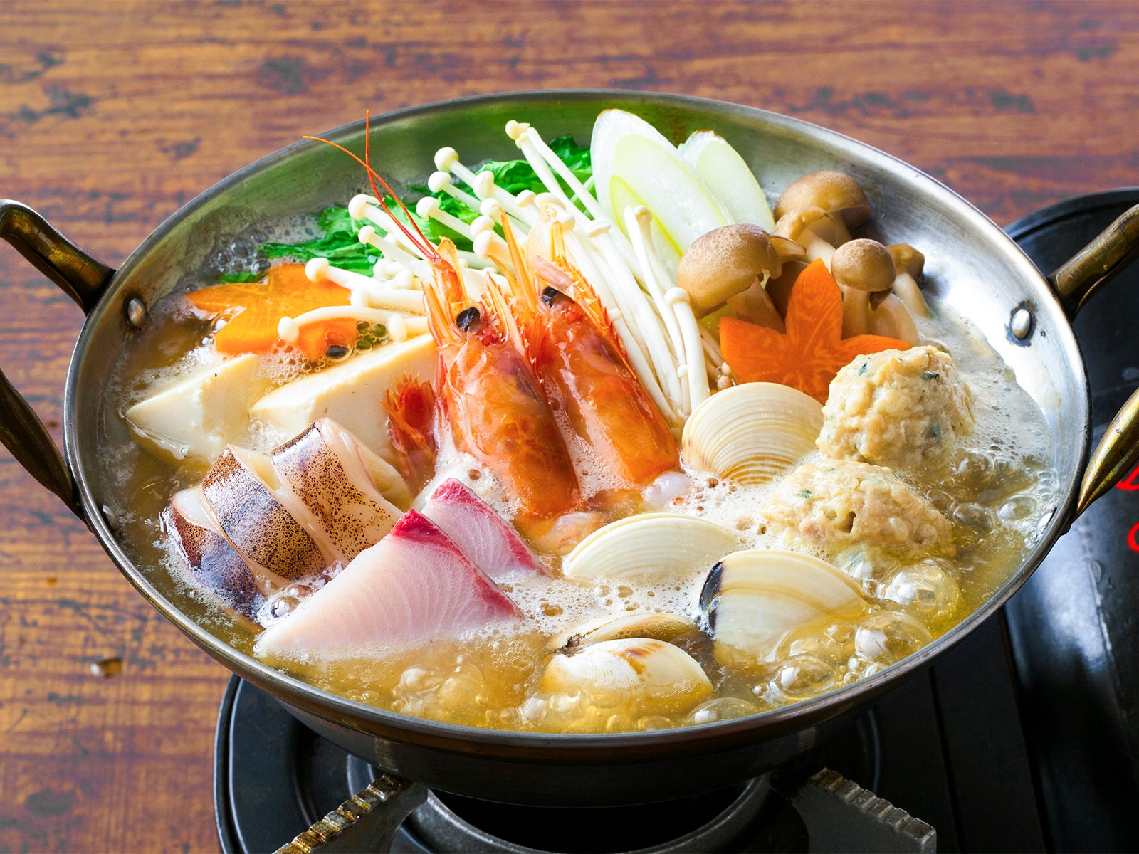- 海鮮寄せ鍋は魚介の旨味がたっぷりで、あごだし香る醤油だし