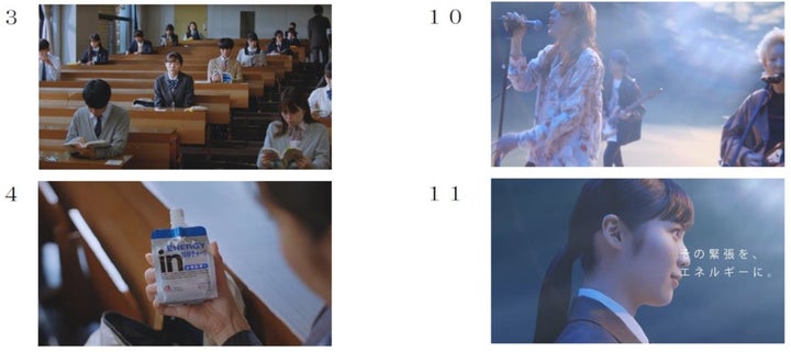 CMでは、緊張する受験生の女子高生がinゼリーエネルギーを飲むと、緊張がほぐれ、SUPER BEAVERが登場し、熱いライブを繰り広げる様子が描かれます。