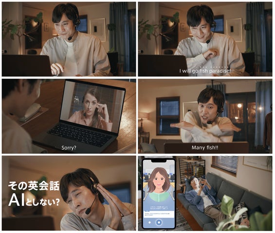 CMでは、話せない状況に直面する学習者の悩みを映像化し、スピークバディを使うことでスムーズに会話できるようになる様子を伝えています。