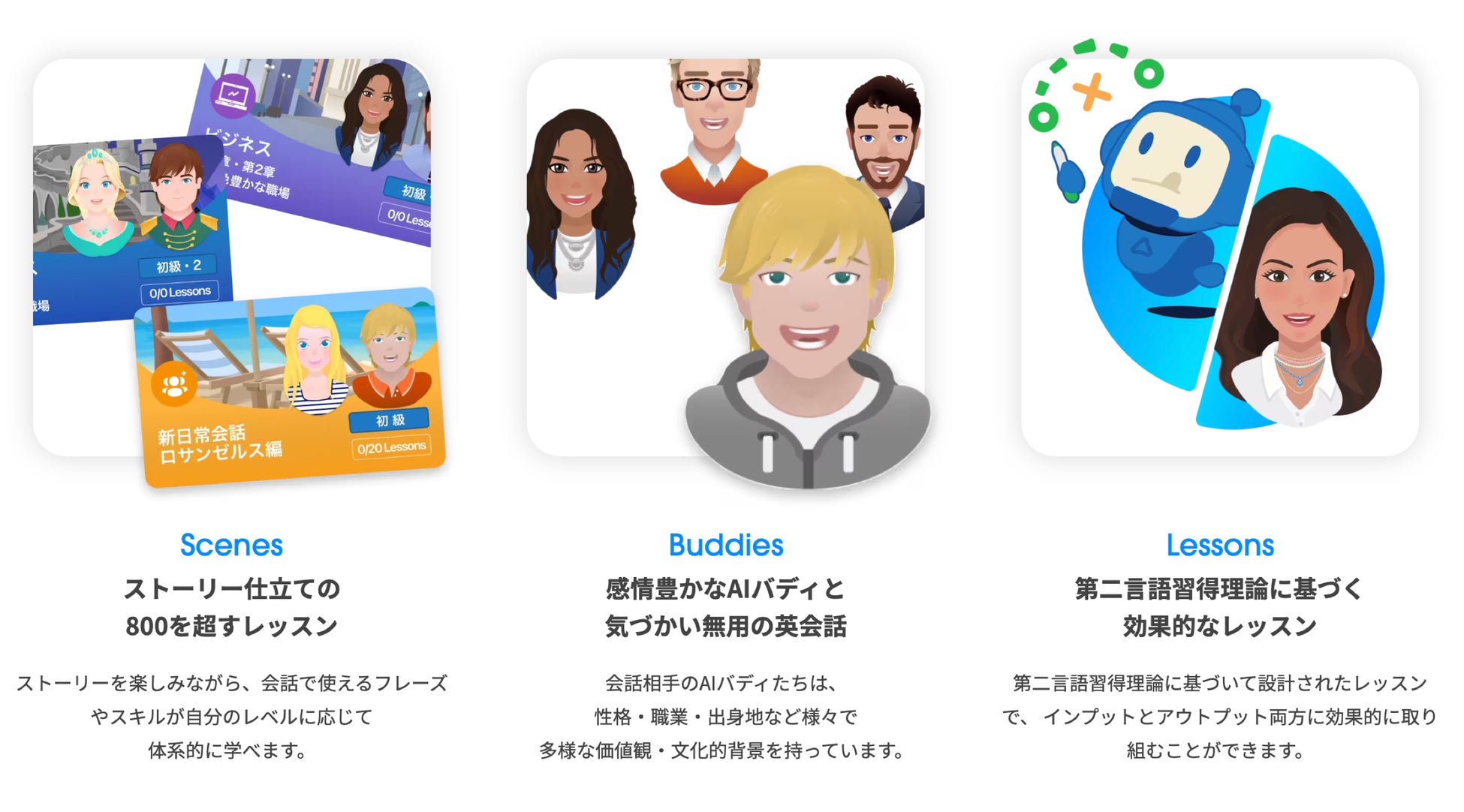 - 感情表現豊かなAIキャラクターとの対話で英語学習を提供