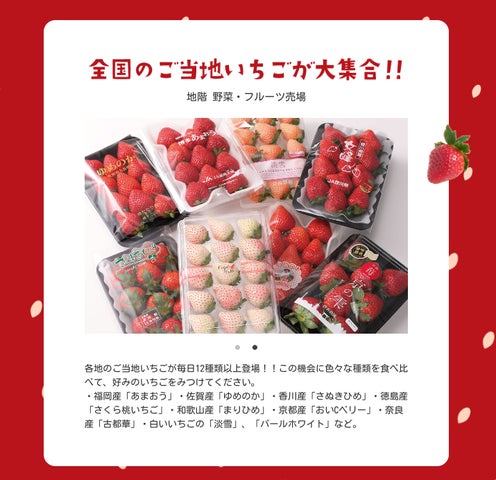 - 地下の野菜フルーツ売場では全国のご当地いちごが12種類以上登場し、好みのいちごを見つけることができる