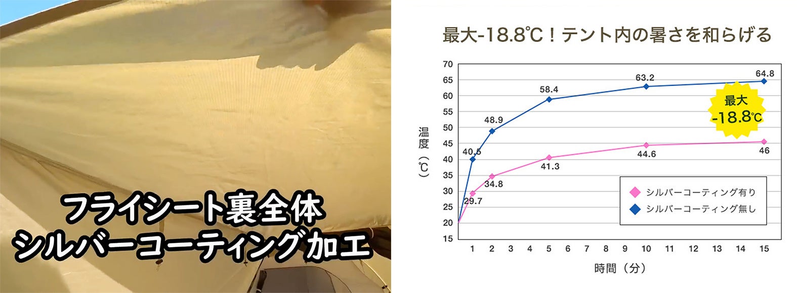 またこのシルバーコーティング加工によって、高い遮熱効果も見られます。日光を模した光を15分照射した実験では、未加工の生地と比較して最大18.8℃の温度差を確認しており、夏の猛暑においてもテント内の温度上昇を軽減する効果が期待できます。