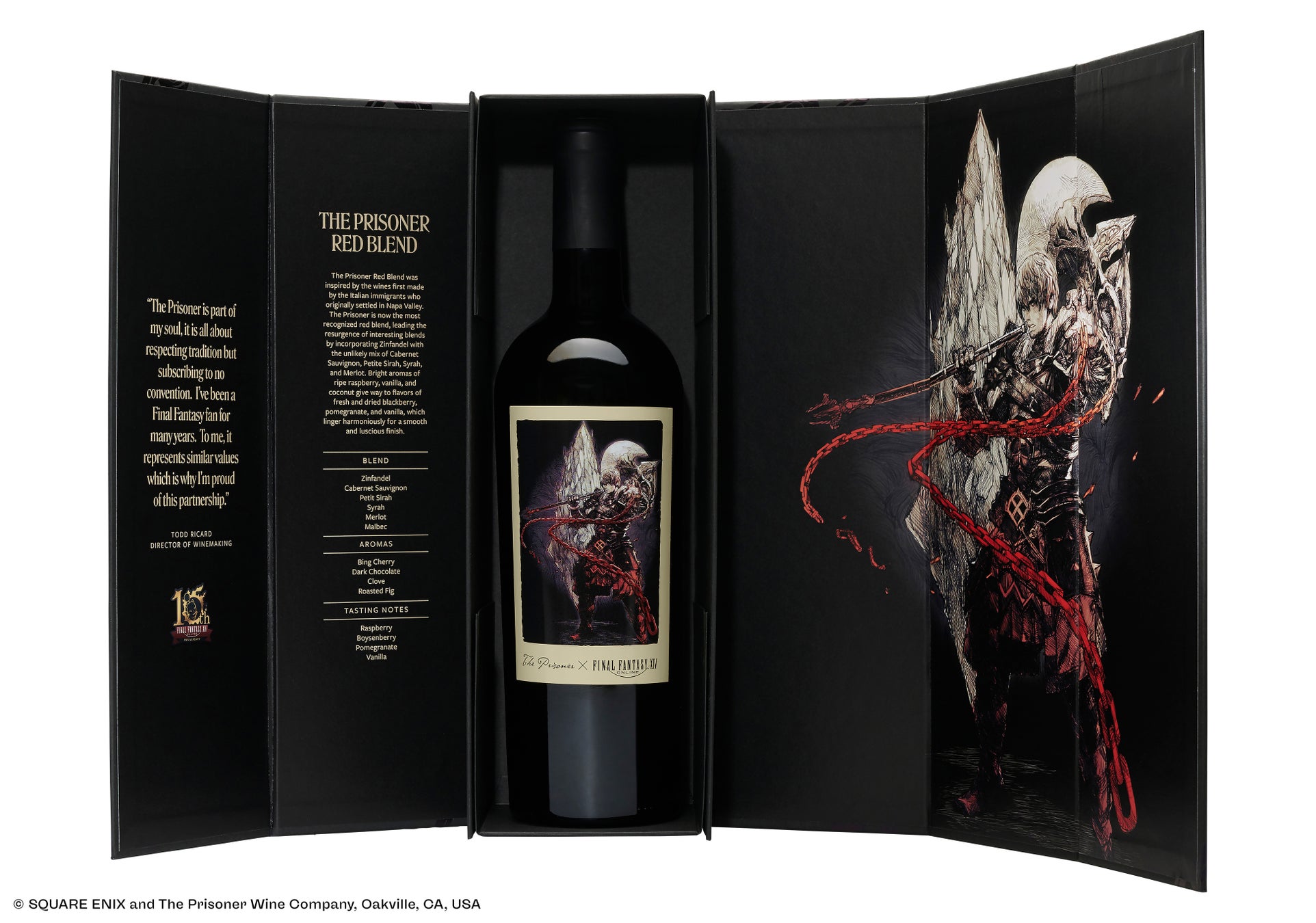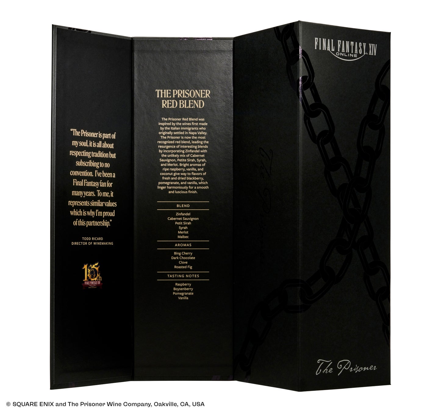 このコラボレーションでは、カリフォルニアのカルトワイン「The Prisoner」とFFXIVを結ぶ鎖をモチーフにしたアートワークのギフトボックスが特徴です。