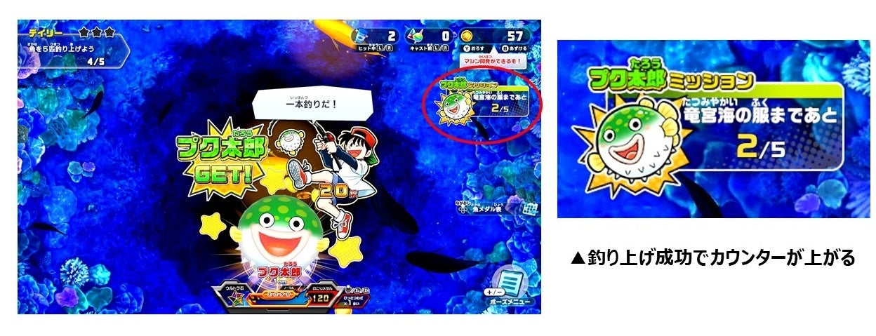 アップデートすると大漁メダルランドに竜宮海のアバターが登場します。『釣りスピリッツ+』でプク太郎の釣り上げに成功すると竜宮海の限定きせかえアイテムが獲得できます。釣り上げの成功数に応じてもらえるアイテムが変化するのでコンプリート目指して釣り上げてください!