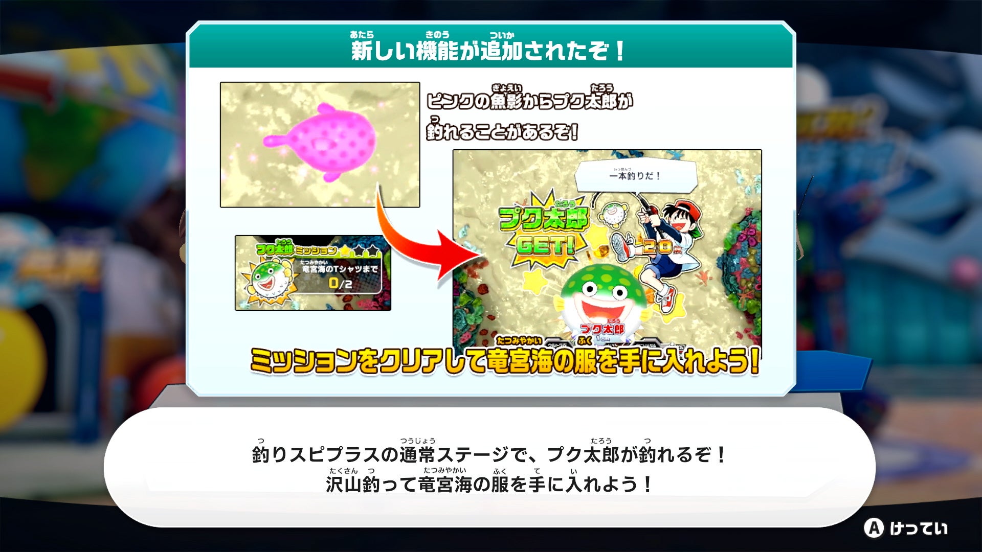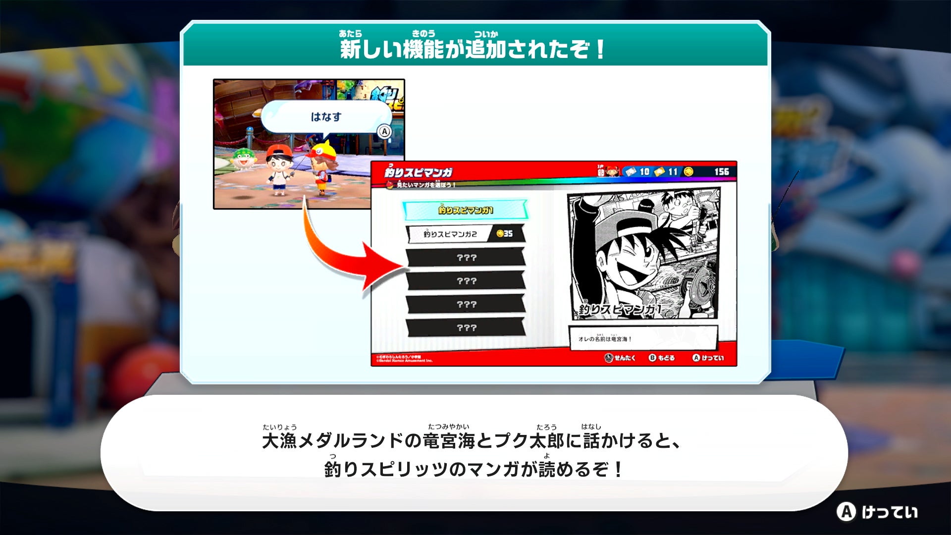 マンガ版『釣りスピリッツ』がメダルを使って読めるようになったり、『釣りスピリッツ+』に限定ミッションが登場したり、コロコロコミックで連載中のマンガ版『釣りスピリッツ』にちなんだ内容となっております。すでに読んだ方もまだ読んでいない方も楽しめる内容となっておりますのでこの機会にアップデートしてお楽しみください。