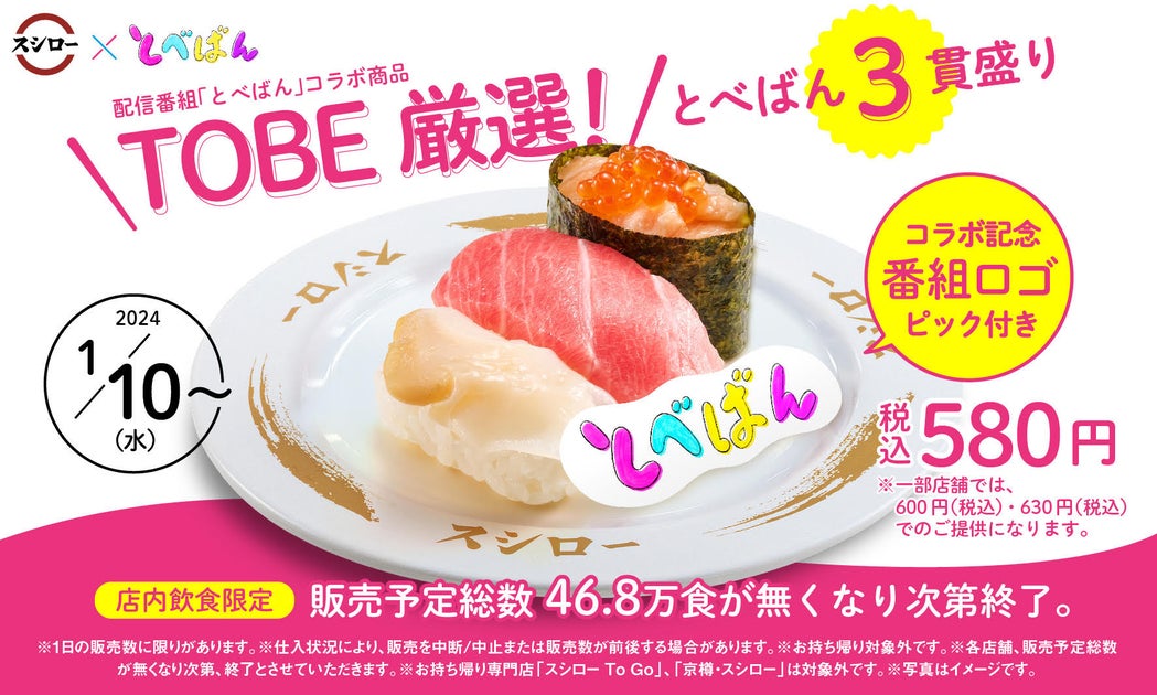 コラボ商品は数量限定で販売され、スシロー店内では「とべばん」の一部シーンが放映されます。