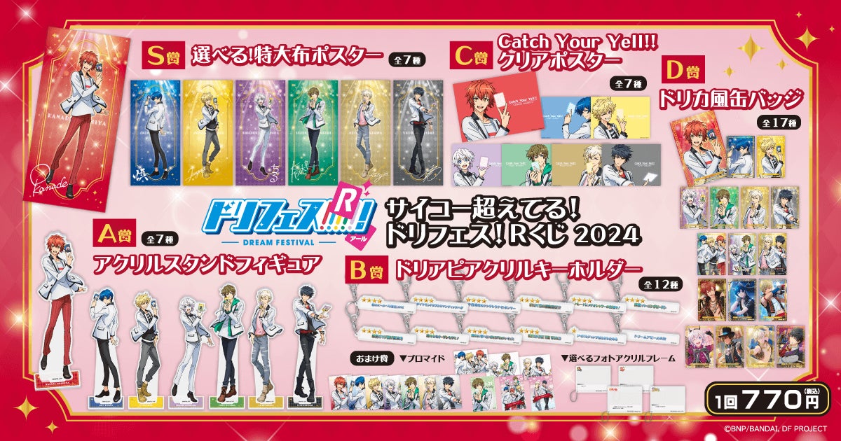 - 商品ラインナップ:S賞 特大布ポスター、A賞 アクリルスタンドフィギュア、B賞 ドリアピアクリルキーホルダー、C賞 Catch Your Yell!!クリアポスター、D賞 ドリカ風缶バッジ