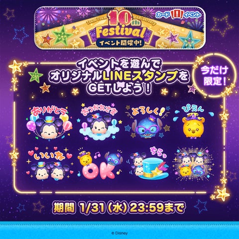 また、ミッションクリアで限定LINEスタンプがもらえる新イベント「Tsum Tsum 10th Anniversary Festival」も開催中です。