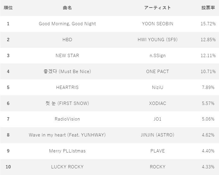 投票結果はランキングに反映され、チャンピオンとなったアーティストの楽曲が番組内で配信されます。