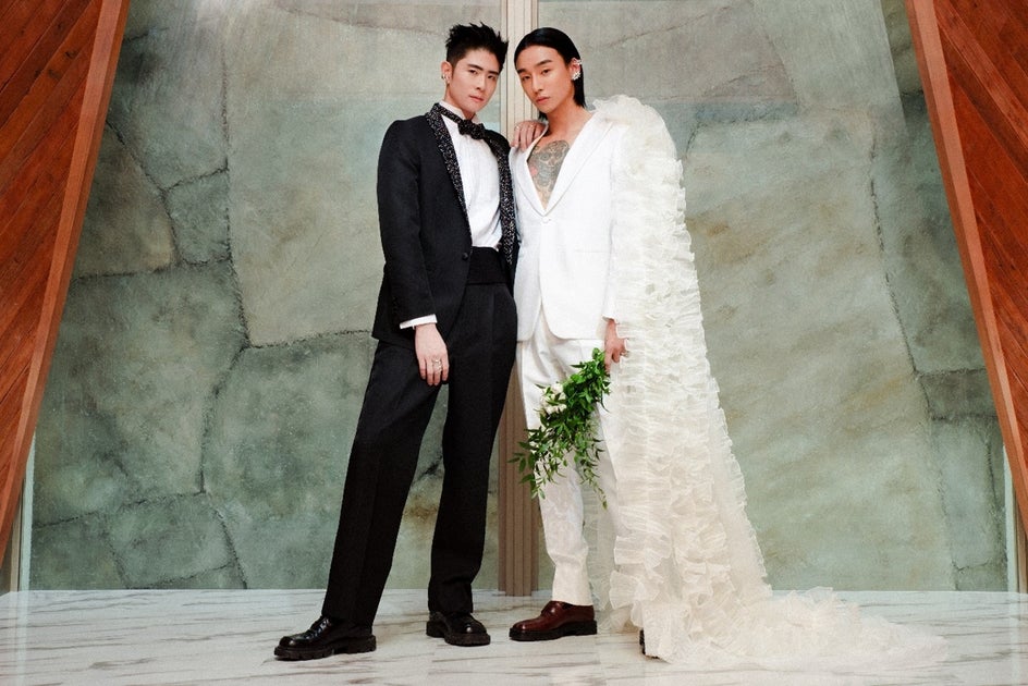 男性カップルがウェディングドレスを着たり、女性カップルがパンツドレスを着用したりと、性別にとらわれない個性的なスタイルも提案しています。