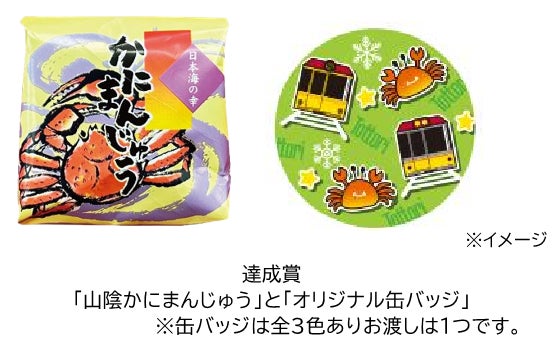 全てのスタンプを集め、鳥取県のアンテナショップでスタンプ台紙を提示すると、先着2,000名に山陰かにまんじゅうとオリジナル缶バッジがプレゼントされます。