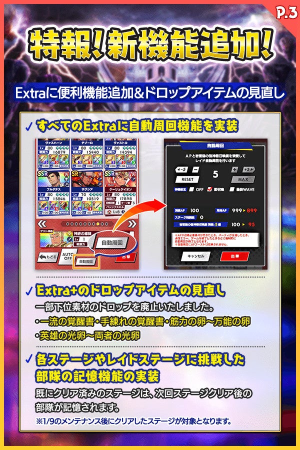 - レイド救援時の消費RPが半減、Extra+の挑戦回数が2回増加、アイテムドロップ数も2倍