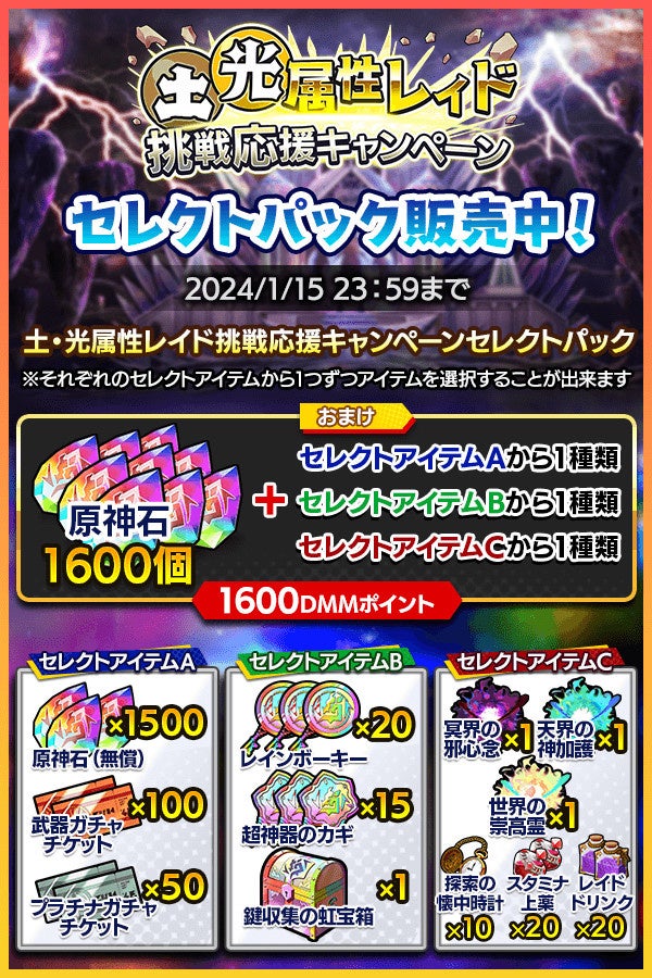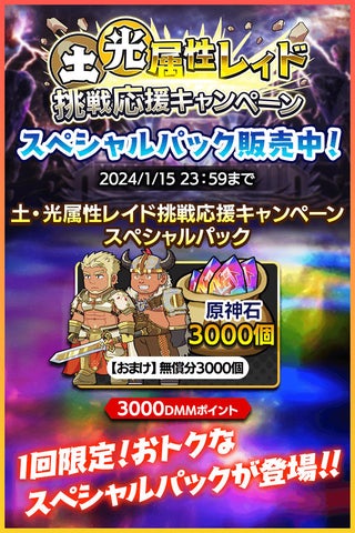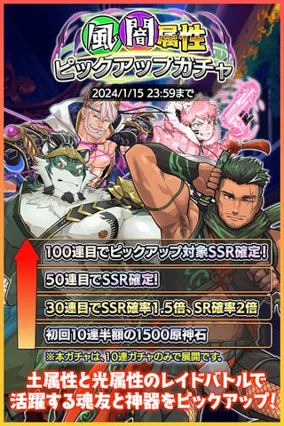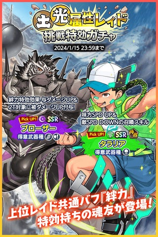 - 土光属性のレイド挑戦特効ガチャや風闇属性ピックアップガチャ開催