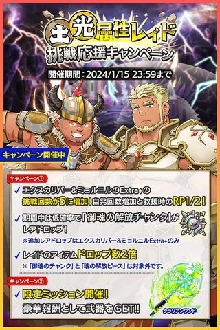 土・光属性のレイドボス、ミョルニルとエクスカリバーに挑戦しやすくなるキャンペーンが開催されます。