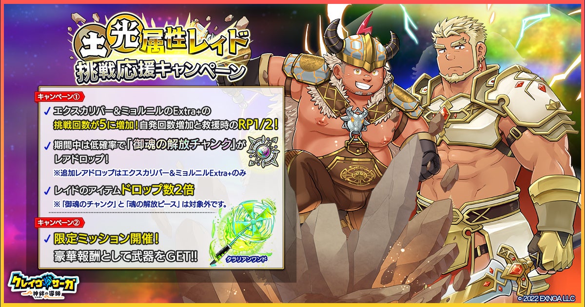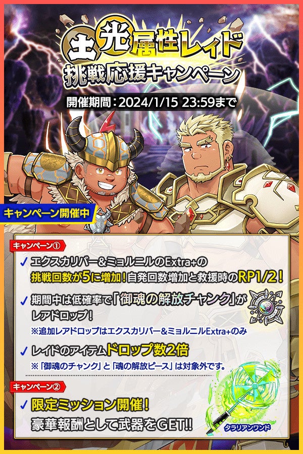 - 土光属性のレイドボス、ミョルニルとエクスカリバーに挑戦しやすくなるキャンペーン
