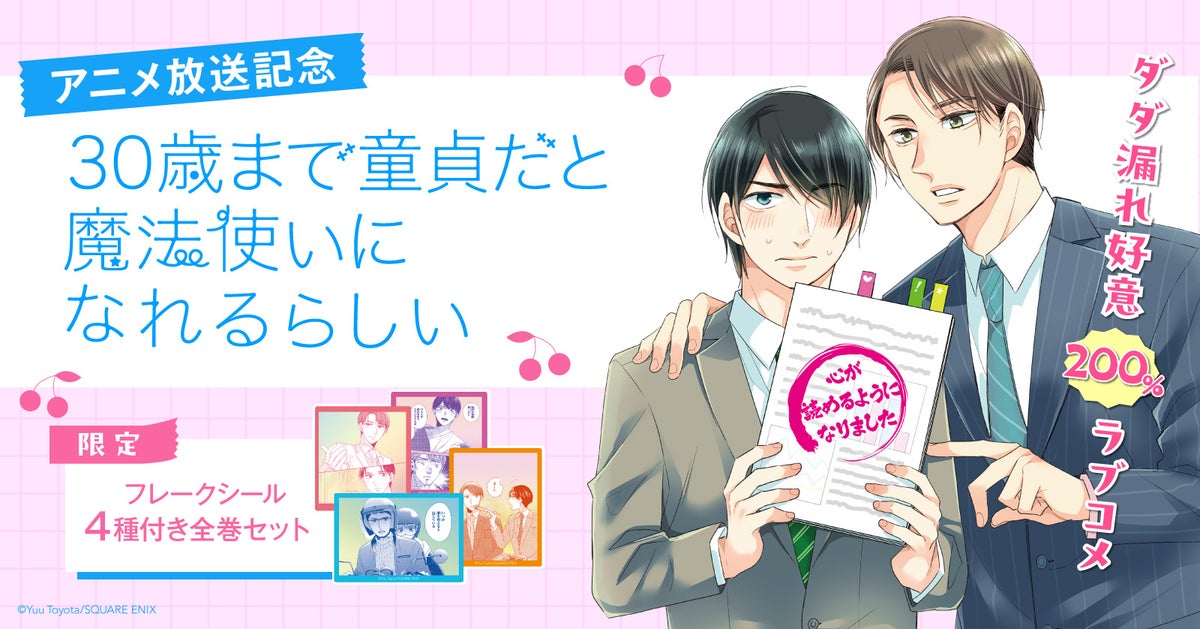 漫画全巻ドットコムでは、アニメの放送を記念して、「30歳まで童貞だと魔法使いになれるらしい」という作品をご購入の方に、当店限定の『フレークシール4種セット』をプレゼントしています!この機会に、大人気のダダ漏れ好意200%ラブコメをぜひお楽しみください♪作品は、30歳まで童貞だった安達が魔法を使えるようになり、同期のイケメン・黒沢の心を読んでしまうというストーリーです。