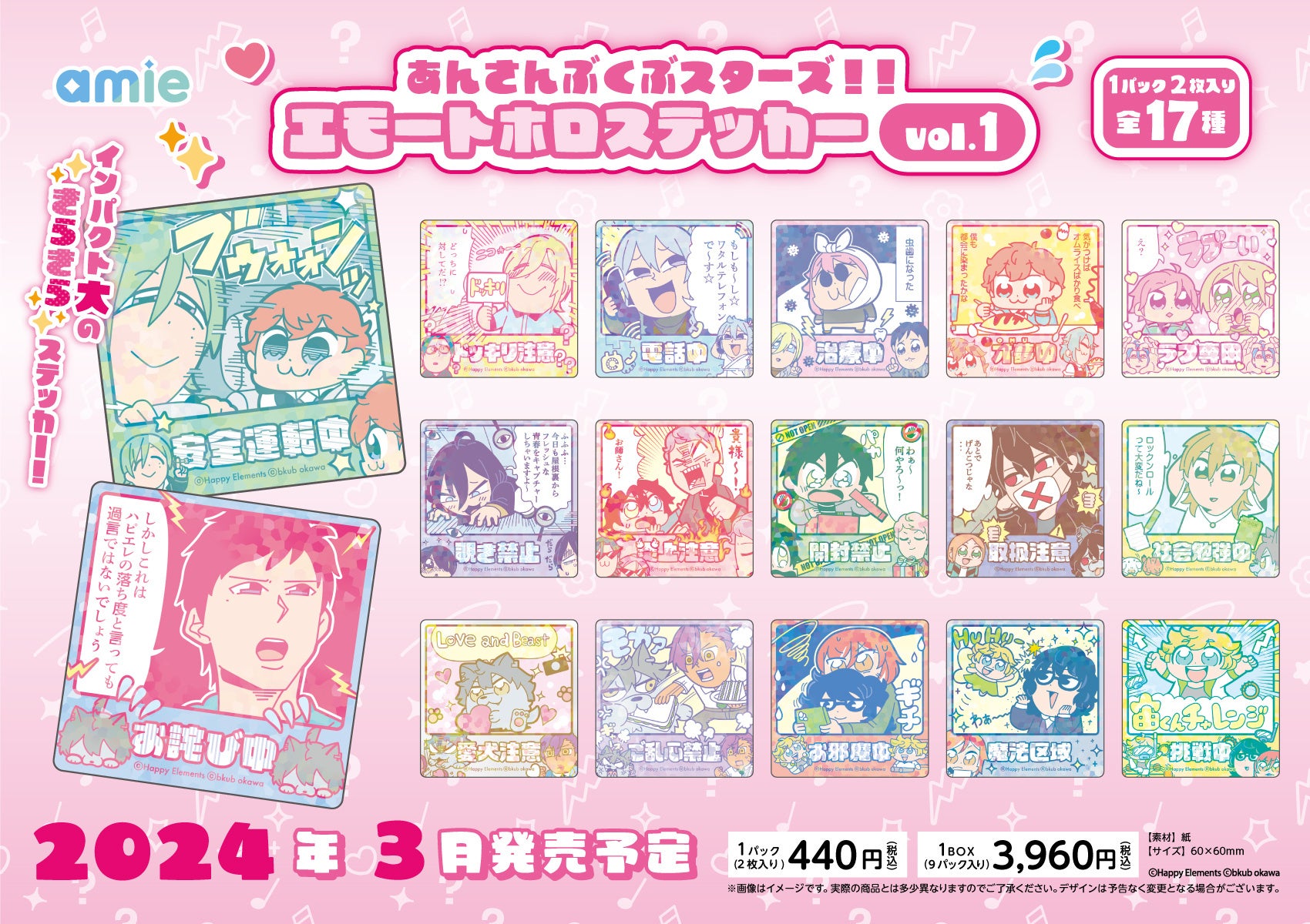 大網株式会社のグッズブランド「amie(アミィ)」から、「あんさんぶくぶスターズ!!」エモートホロステッカーのvol.1~3が登場しました。