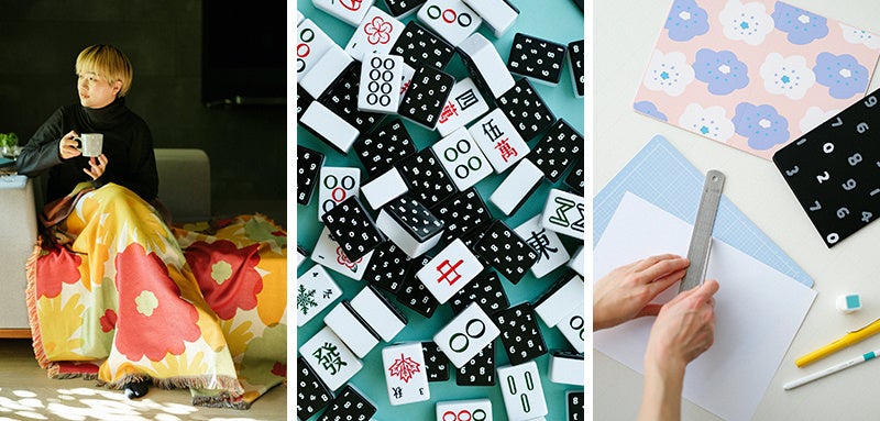 - 理想的文具、ショルダーバッグ、巾着型バッグ、エコバッグ、ガーゼタオル、ピクニックブランケット、糸綴じノート、カッターマット、テキスタイルトランプ、台湾式麻雀セット