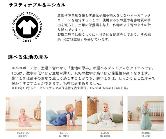 エルゴポーチは巻かないおくるみやスリープウェアを提供し、赤ちゃんの心地よい眠りをサポートします。