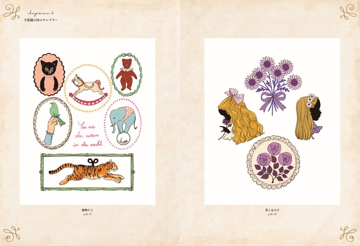 • かわいくて不思議なイラストが特徴で、少女や動物、季節のこどもたちなどが描かれています。