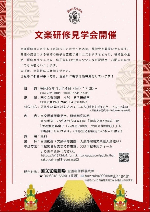 また、文楽研修の相談会も2月12日に東京で開催されます。