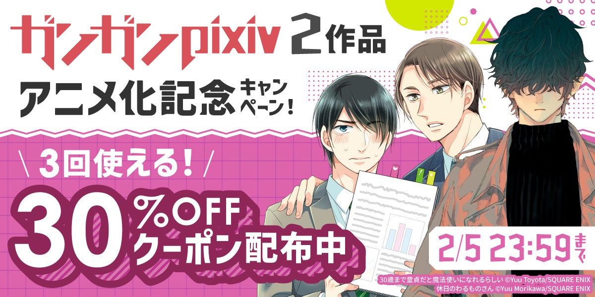 「30歳まで童貞だと魔法使いになれるらしい」と「休日のわるものさん」のマンガが無料で再公開され、さらにボーナスコインもプレゼントされます。