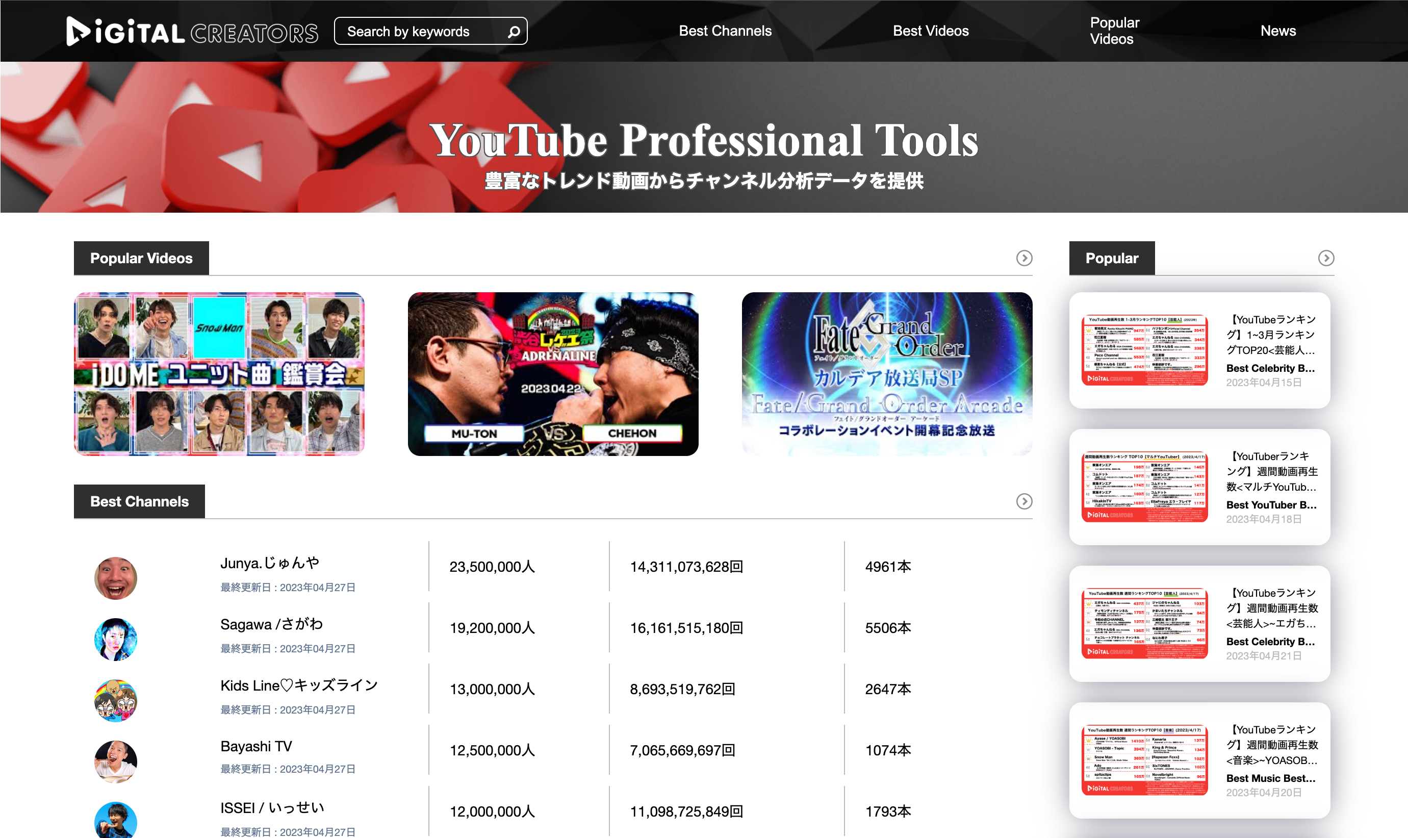 Digital Creatorsは、YouTubeの人気チャンネルや動画などのランキングデーターを無料でチェックできるサイトです。YouTube動画再生数ランキングは、週間ランキングや月間ランキングや年間ランキングなど期間別のランキングのほかに、ジャンル別ランキングなど、様々なデーターを公開していく予定です。