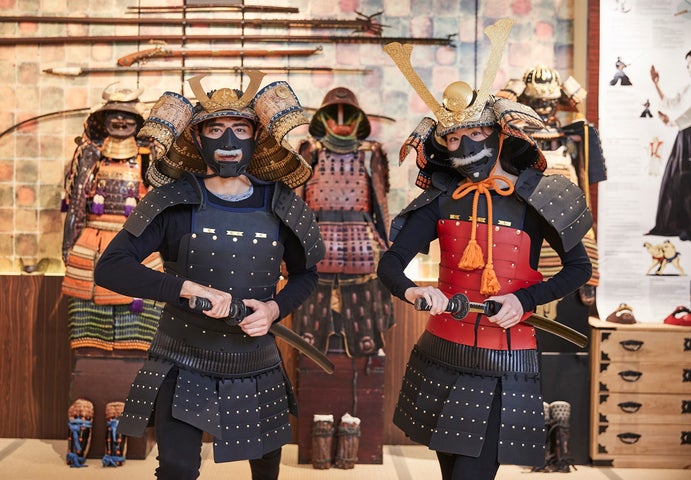 ベーシックチケットでは、甲冑体験や手裏剣投げなど、サムライと忍者の体験が楽しめます。