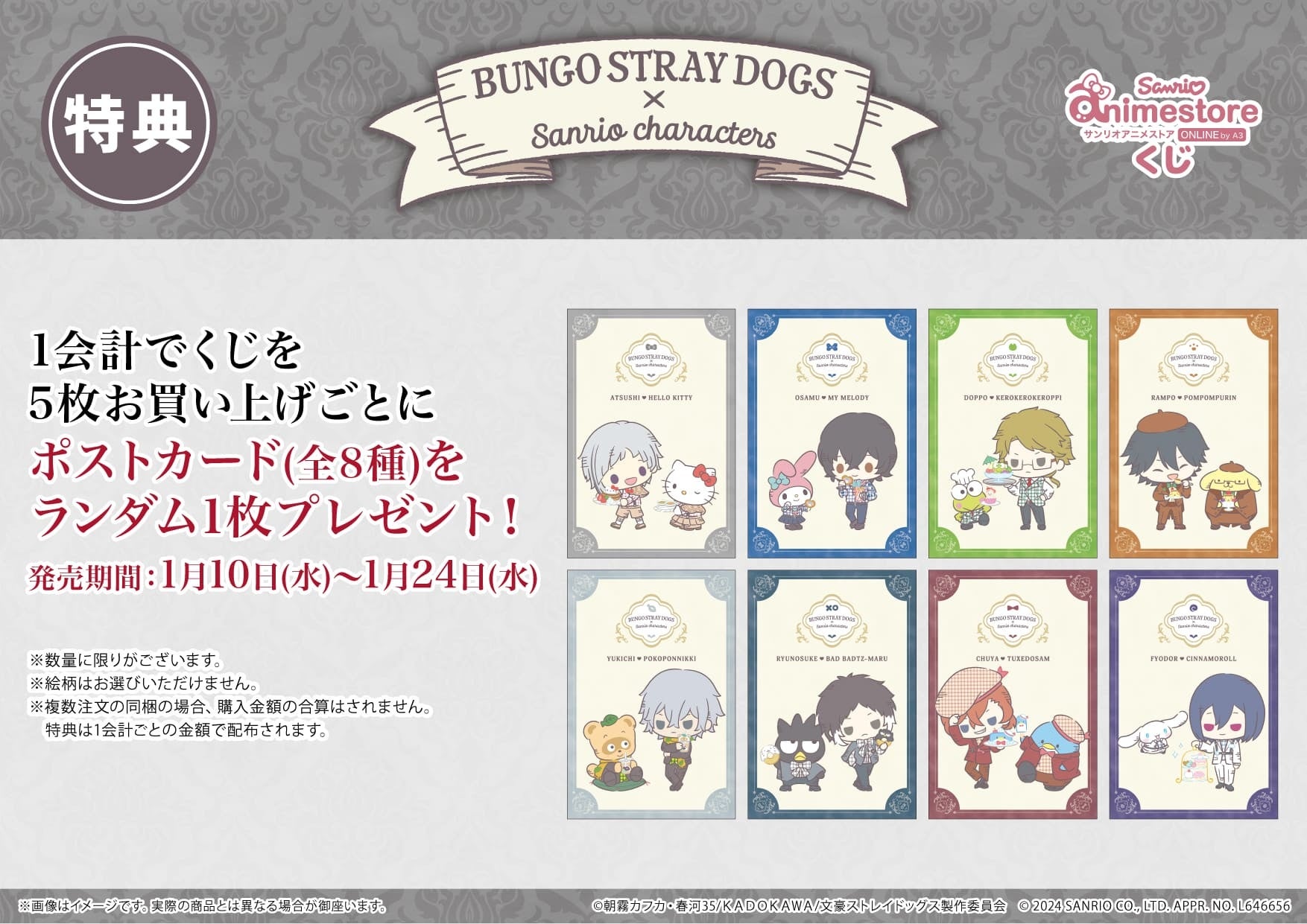 2024年1月10日から、サンリオアニメストアONLINEで「文豪ストレイドッグス×サンリオキャラクターズ」のオンラインくじ「サンリオアニメストアくじ」が販売されます。