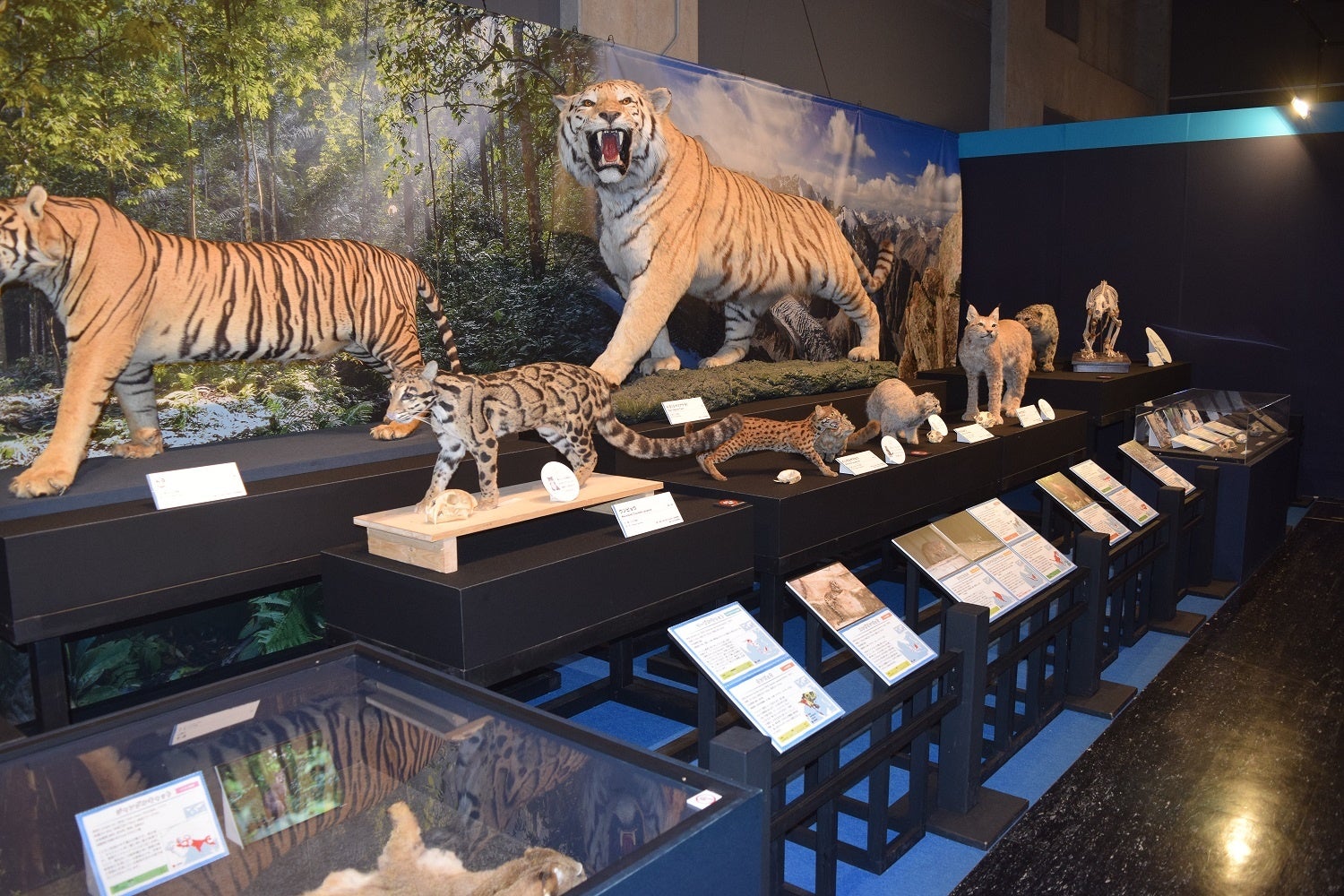 この展示では、40種の野生ネコ科動物がさまざまな環境で生息していることを紹介します。