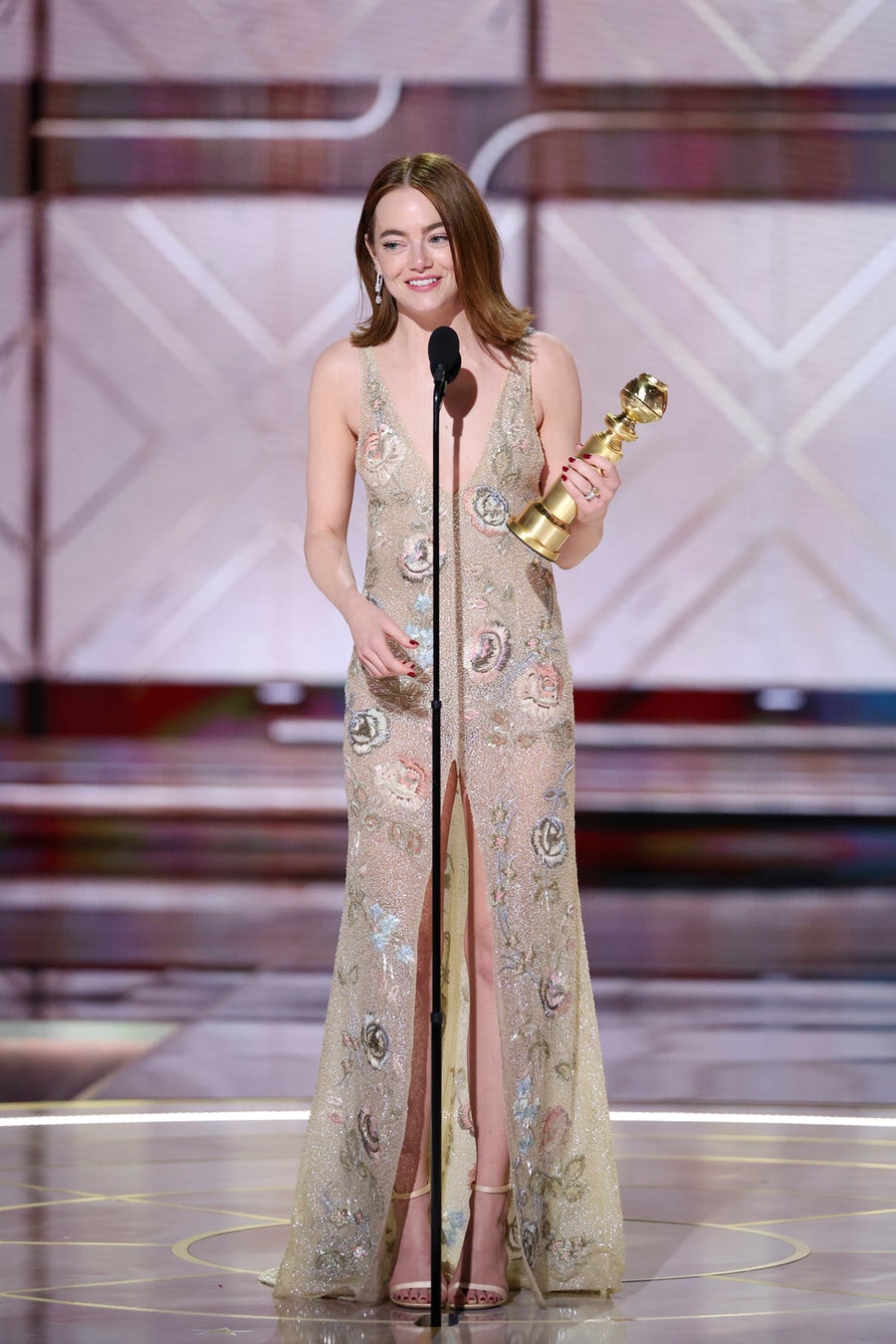 ブラッドリー・クーパーは、ルイ・ヴィトンの特注のブラックのダブルブレストウールタキシードを着用し、エマ・ストーンはスパンコールで刺繍されたフラワーモチーフのガウンを選びました。