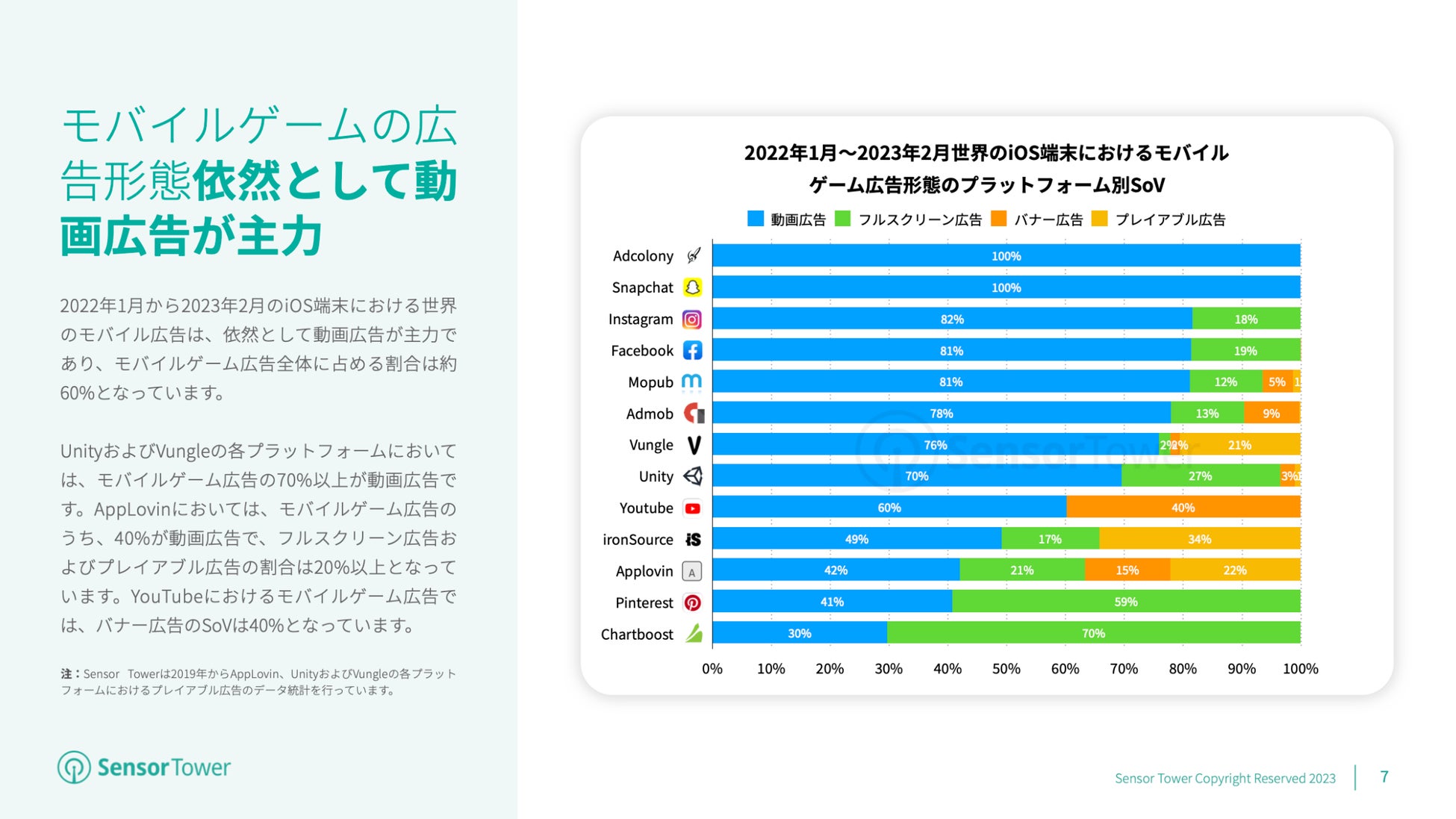 世界のモバイル広告は依然として動画広告が主力であり、2022年1月から2023年2月のiOS端末モバイルゲーム広告全体に占める動画広告の割合は約60%となっています。ほかのプラットフォームに目を向けると、UnityおよびVungleにおいてはモバイルゲーム広告の70%超がビデオ広告形態を採用しており、AppLovinにおいてはフルスクリーン広告およびプレイアブル広告の割合が20%を超え、YouTubeにおいてはバナー広告のSoV(Share of Voice)が40%に達しています。