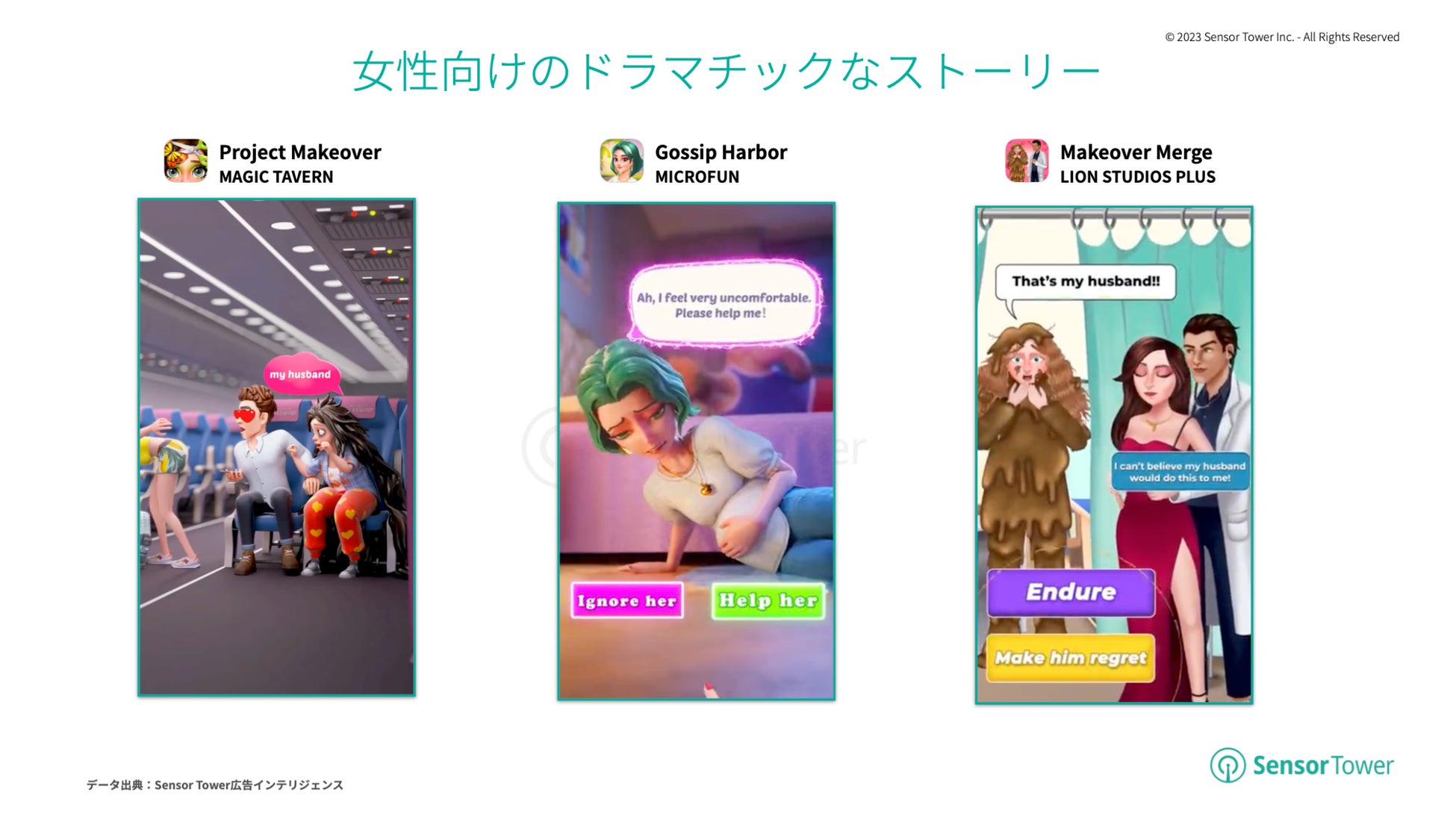 『Project Makeover』や『Gossip Harbor: Merge & Story』などに代表される女性プレイヤー向けのモバイルゲームについて、その広告クリエイティブは女性主人公をめぐるドラマチックなライフストーリーでユーザーの同情心をあおっています。中でもモバイルマージゲーム『Gossip Harbor: Merge & Story』は、すでにMicrofunの2023年第1四半期収益が最高のモバイルゲームになっています。