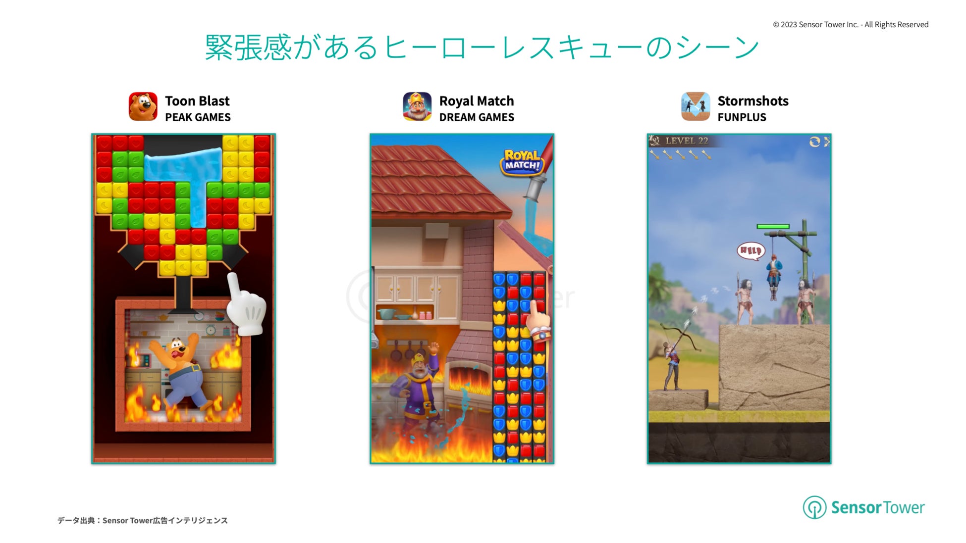 Peak Gamesのタイルブラストゲーム『Toon Blast(トゥーンブラスト)』、Dream Gamesのマッチ3ゲーム『ロイヤルマッチ(Royal Match)』、FunPlus International AGの4Xストラテジーゲーム『Stormshot(銃弾射撃)』の広告クリエイティブは、緊張感があるヒーローレスキューのシーンを利用してプレイヤーにゲームへの参加を呼びかけています。Sensor Towerのストアインテリジェンスのデータによると、『ロイヤルマッチ(Royal Match)』は2022年に世界で収益が最も増加したモバイルパズルゲームとなっています。