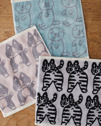 みやぎちかのオリジナルデザインの猫雑貨には、ハチワレの「ハチ」、たれ耳の「タレ」、トラ猫の「トラ」という3匹のネコたちが描かれています。