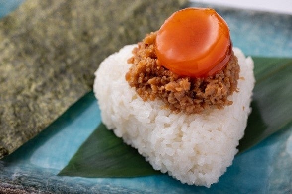 - 銀シャリのご馳走おにぎりは、特製の漬けだれに24時間漬け込んだ卵黄と甘辛い鶏そぼろを組み合わせた一品