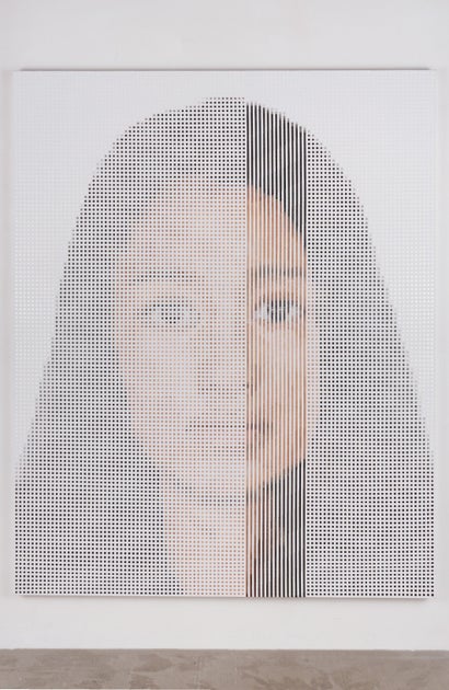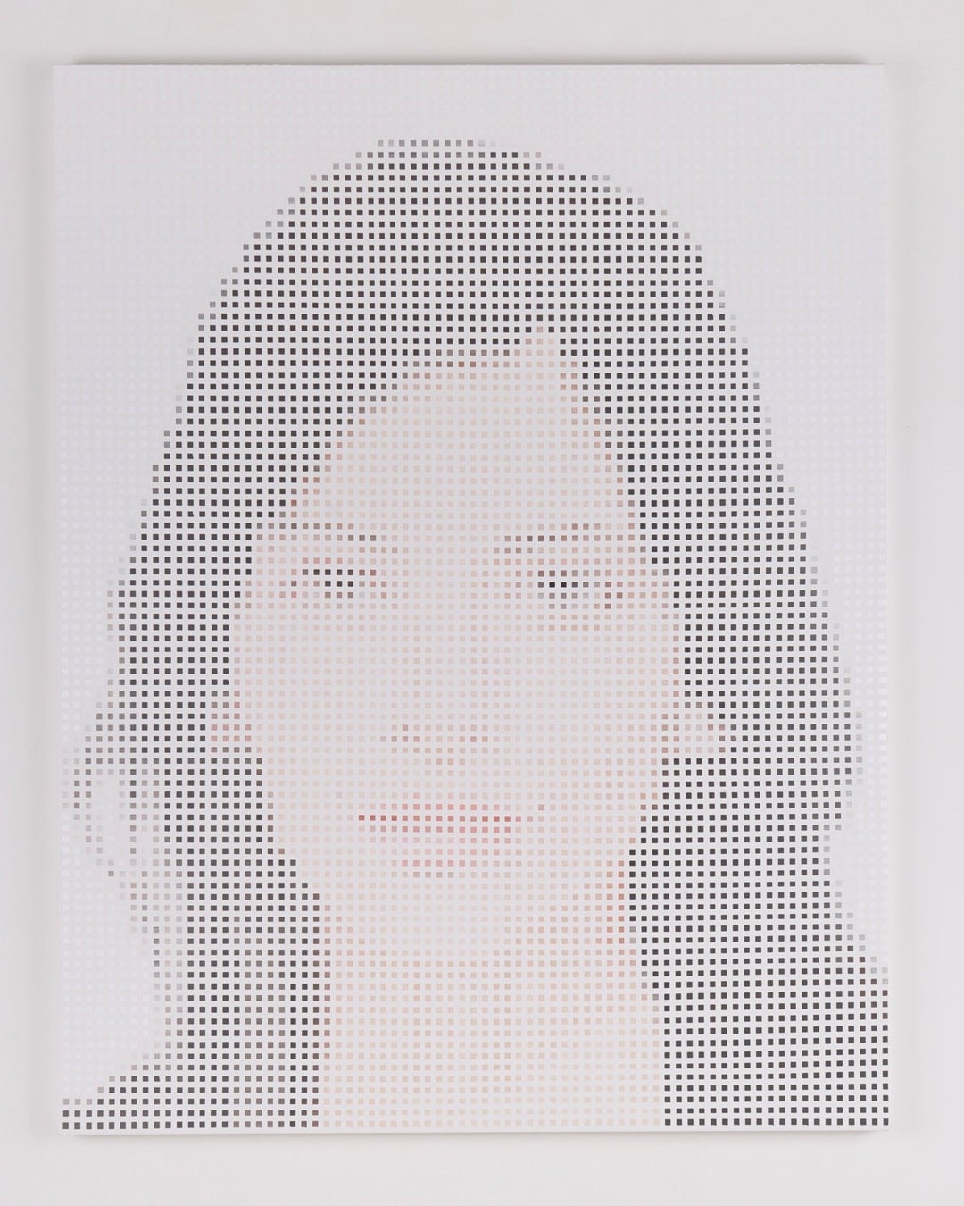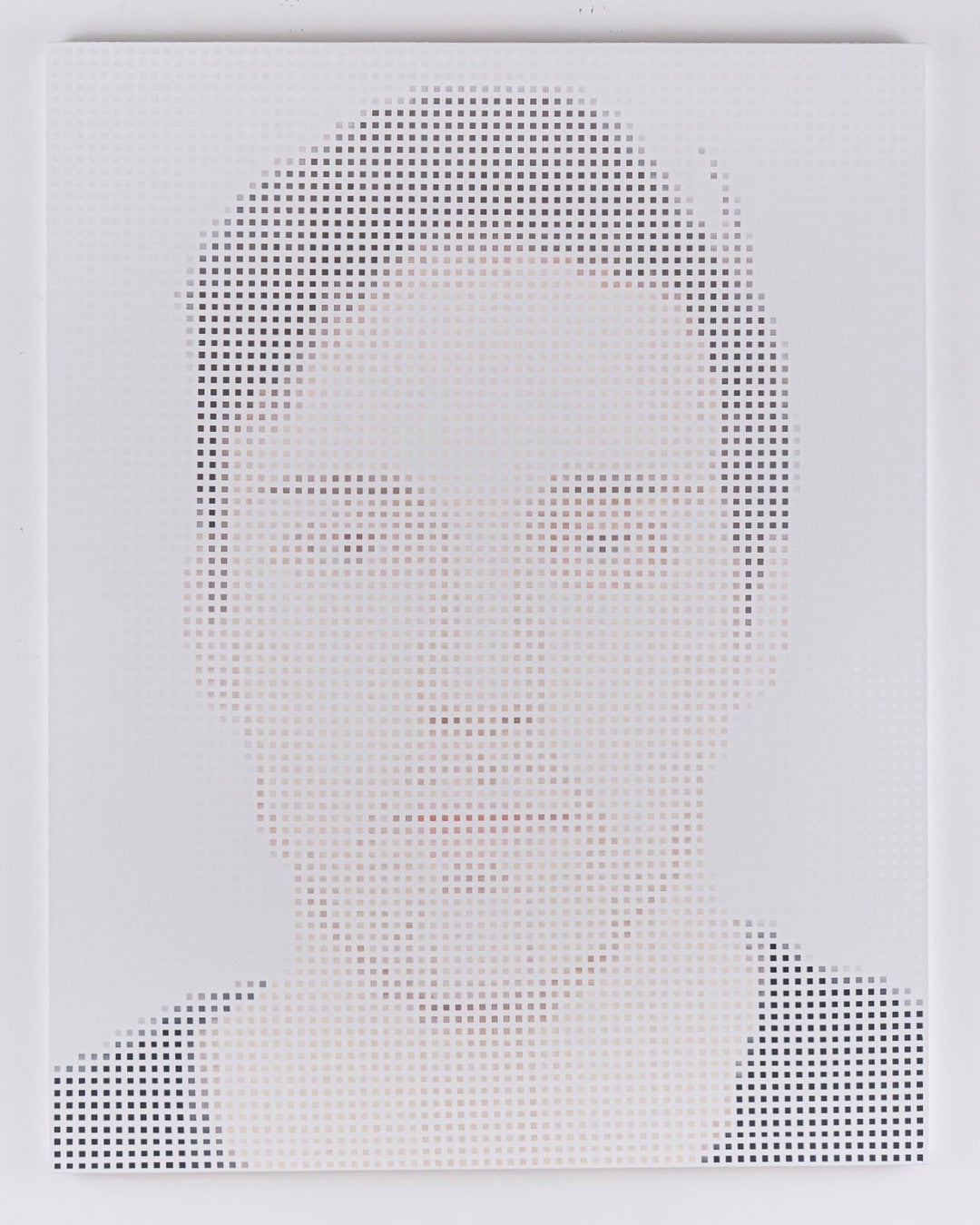 • 代表作の「tie」シリーズは、ピクセル状に分解された証明写真を拡張して描かれたポートレート作品