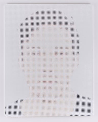 彼の代表作の一つである「tie」シリーズは、人物の証明写真をピクセル状に分解し、拡張して描かれたポートレート作品です。