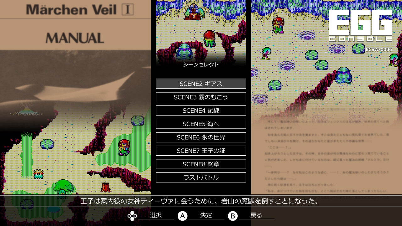 『EGGコンソール メルヘンヴェール PC-8801mkIISR』では、シーンセレクトモードやギャラリーモードを楽しむことができます。