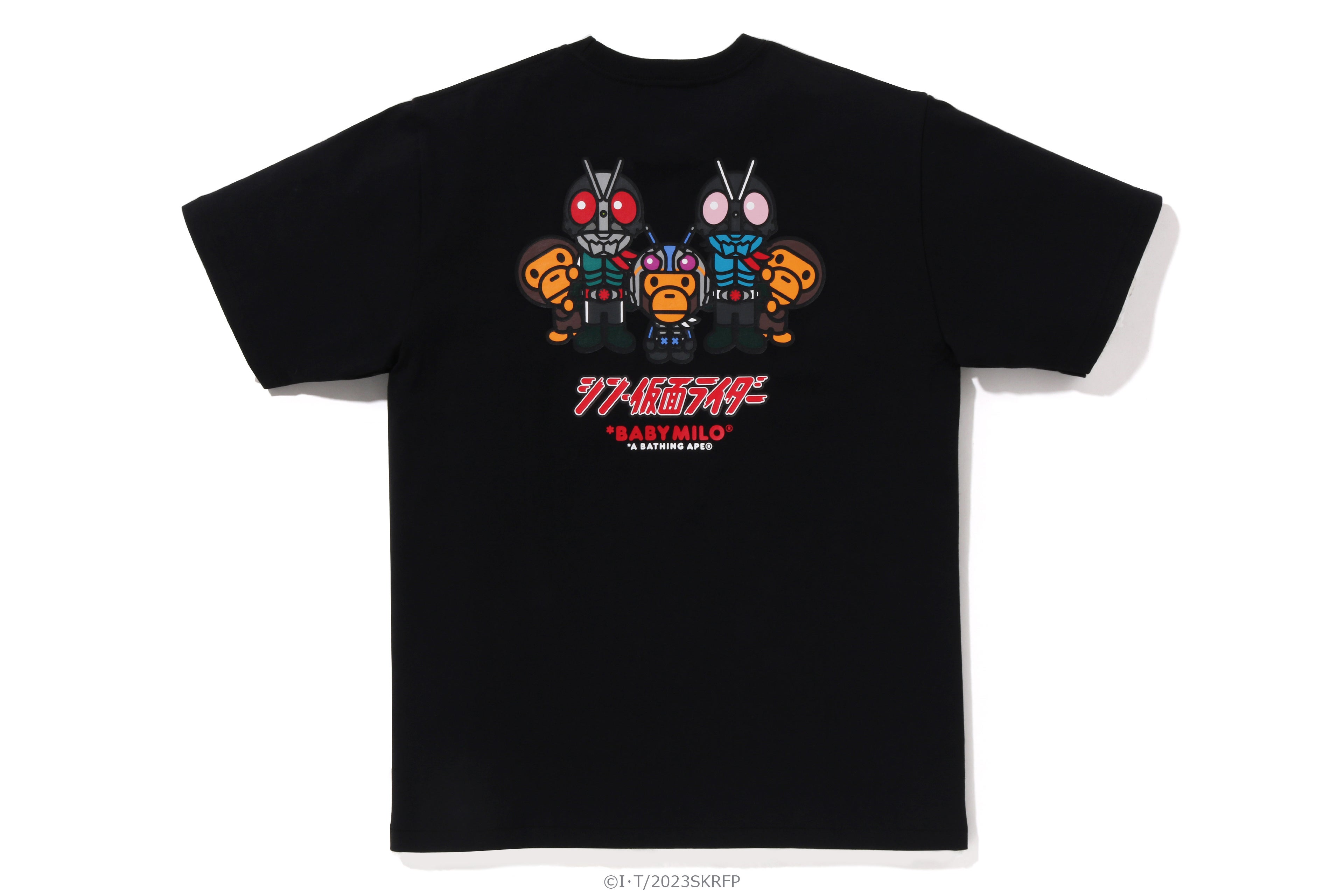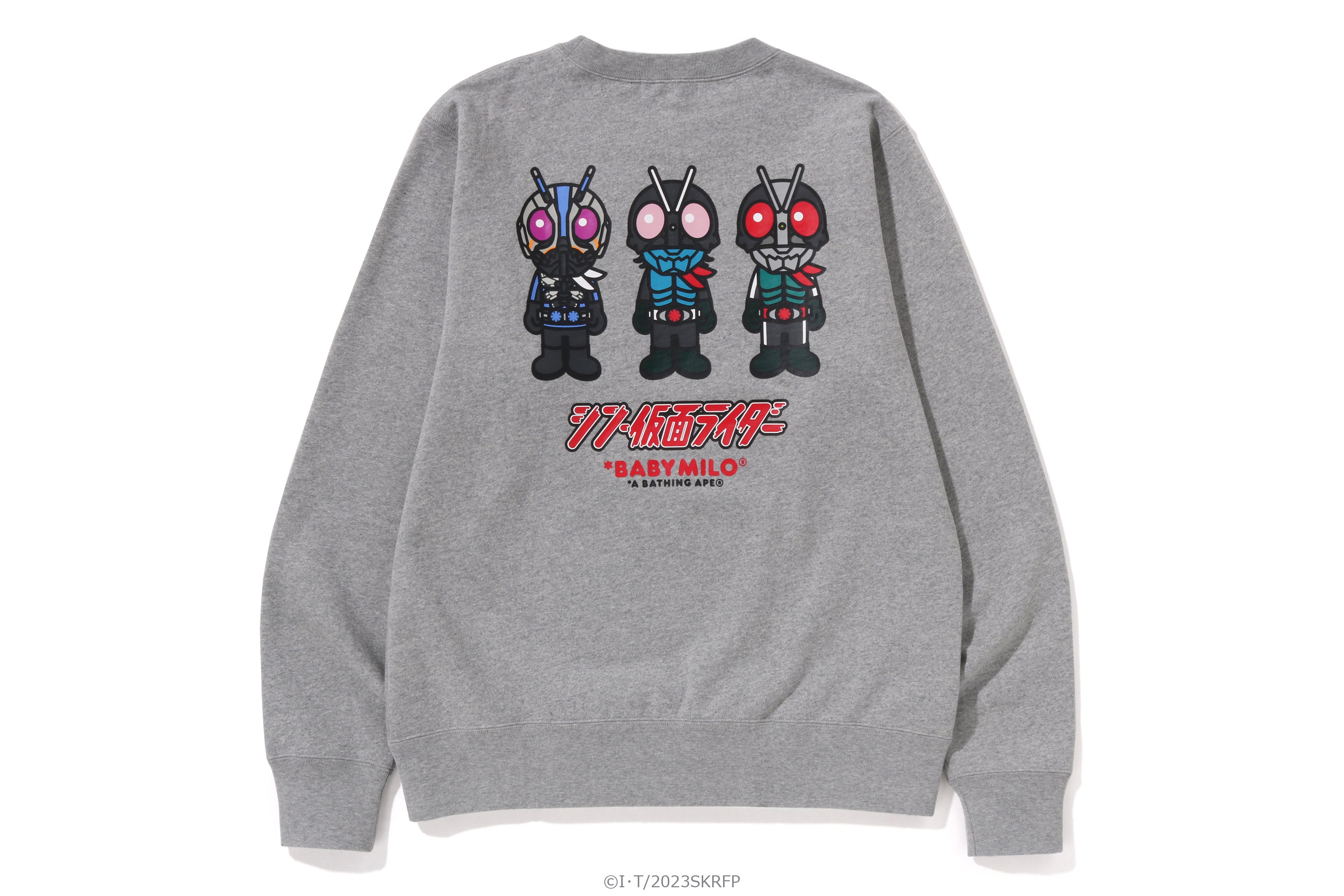 今回のコラボレーションでは、「BABY MILO(ベイビーマイロ)®︎」のタッチでデフォルメされた仮面ライダーをメインビジュアルに採用、さらに定番の「APE HEAD」や「BAPE CAMO」と「SHOCKER(ショッカー)」のモチーフをグラフィックに落とし込んだアイテムなどを展開。Tシャツやスウェットなどのアパレルからキーホルダー、さらに「BABY MILO®︎」シリーズではKIDSラインも用意するなど、デイリーに使えるアイテムを揃えました。