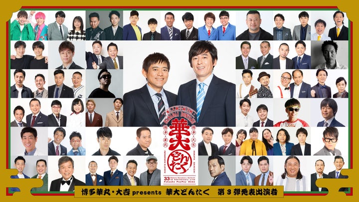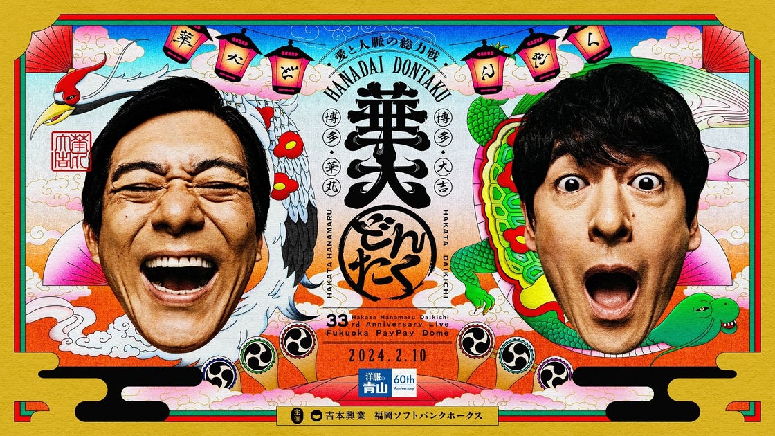 博多華丸・大吉がコンビ結成33周年を迎え、2024年2月10日に福岡PayPayドームでお笑いイベント『博多華丸・大吉 presents 華大どんたく supportedバイ 洋服の青山』を開催します。