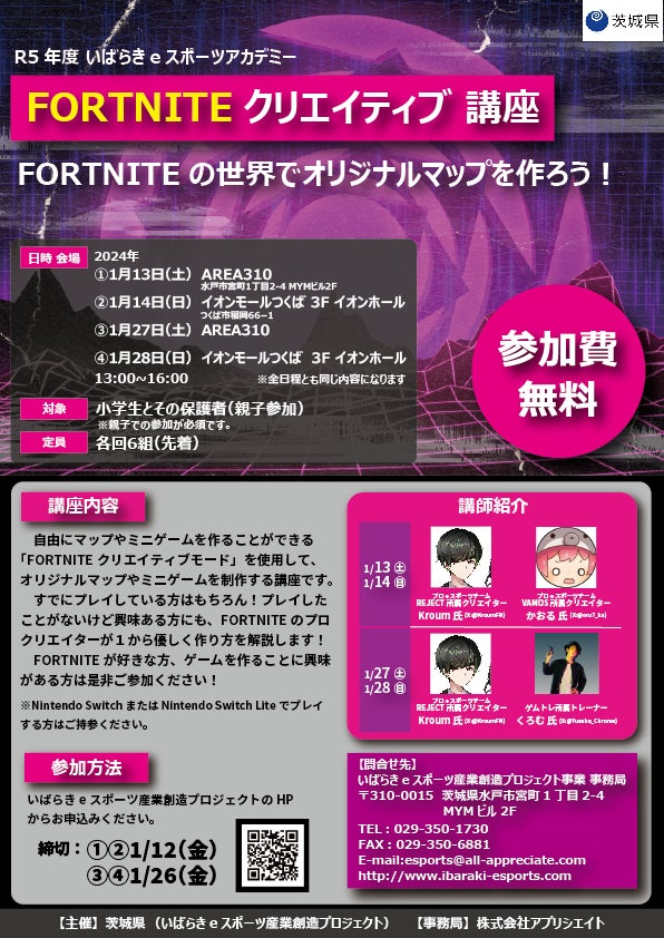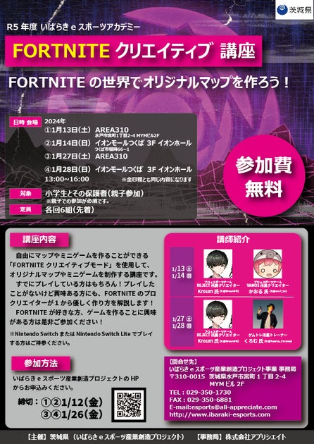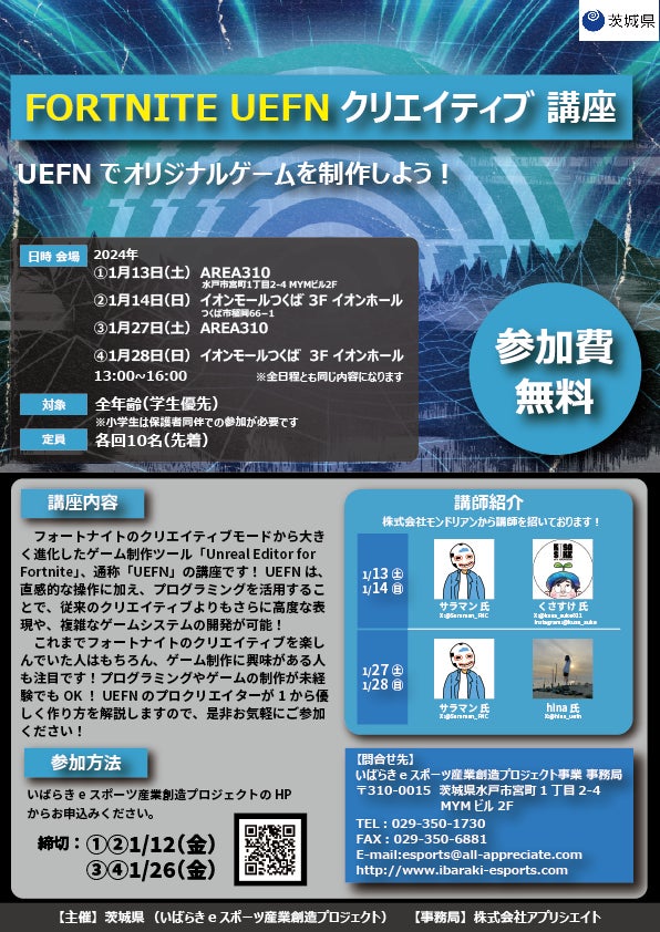 - AREA310、イオンモールつくば、Epic Games、いばらきeスポーツ産業創造プロジェクト推進協議会、いばらきeスポーツアカデミー