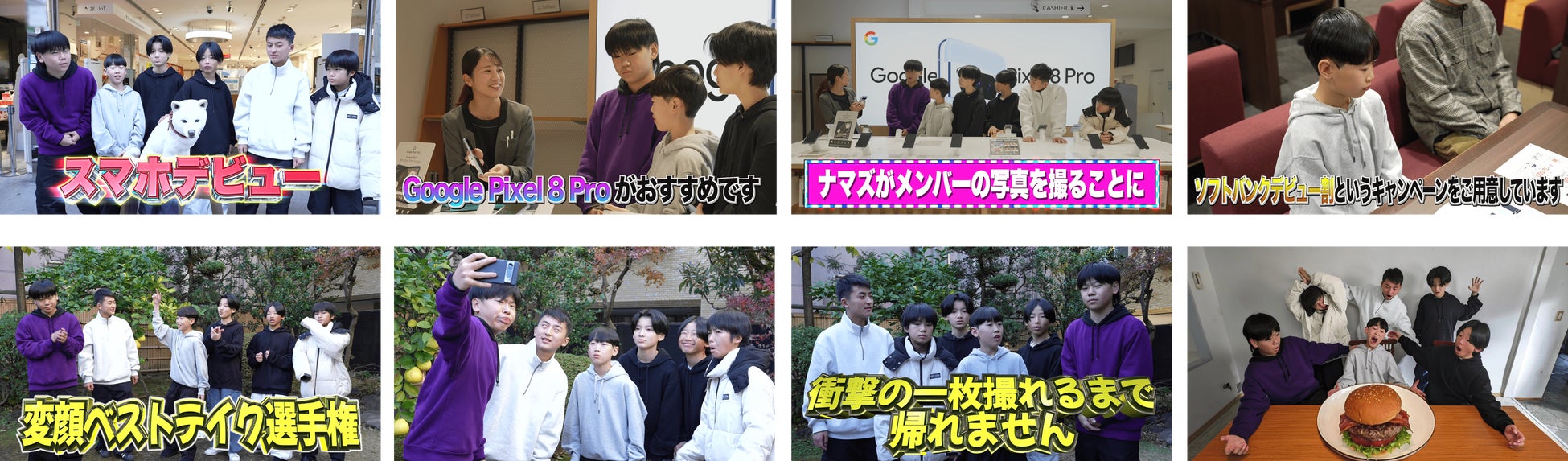 さらに、スマホデビュー後にはGoogle Pixel 8シリーズの新機能を使って変顔ベストテイク選手権や衝撃的な写真作り企画が開催され、メンバーが楽しく遊ぶ様子も見どころです。